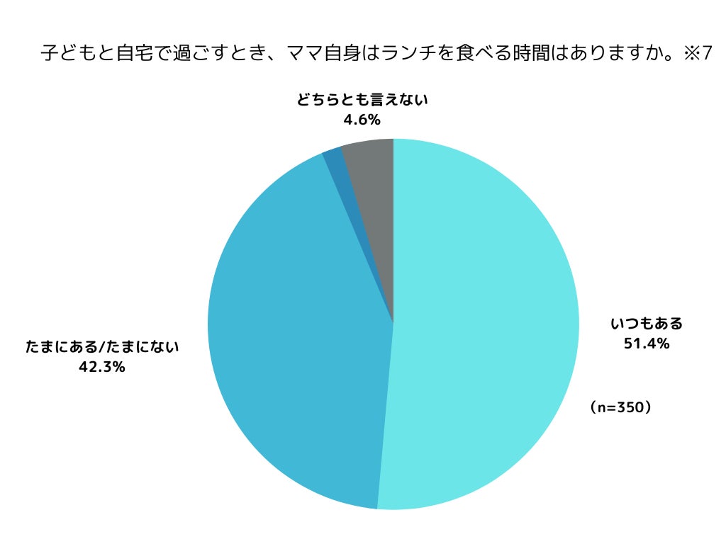 また今回の調査結果からは、子どもと自宅で過ごすとき、そもそも自分自身のランチを「食べる時間がない」「たまに食べる時間がない」ママが44%いることも明らかになりました。(※7)