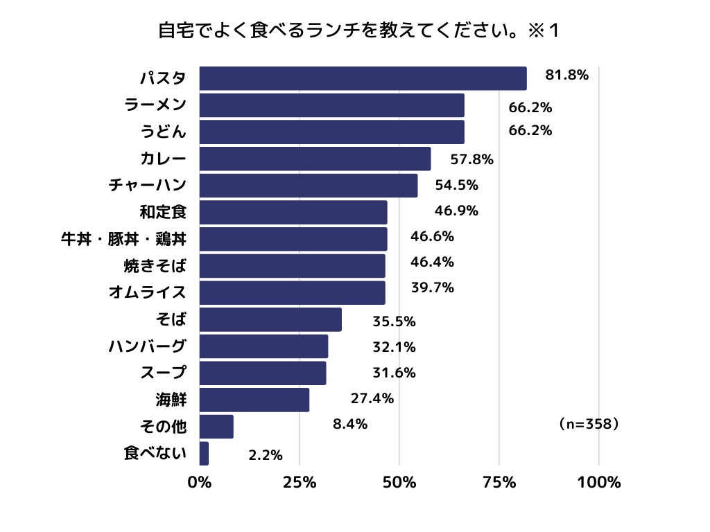 子育て中のママたちに自宅でよく食べるランチメニューを聴取したところ、第1位は「パスタ(81.8%)」、続いて「ラーメン(66.2%)」、「うどん(66.2%)」が同率に並び、麺類の人気の高さがうかがえます。(※1)