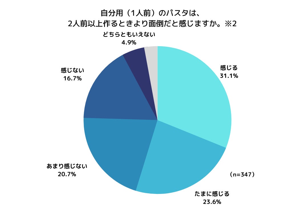 しかしながら、「パスタ」は人気メニューである一方、自分用(1人前)だけのパスタを調理することを面倒だと「感じる」「たまに感じる」人は54.7%と半数を上回りました。(※2)