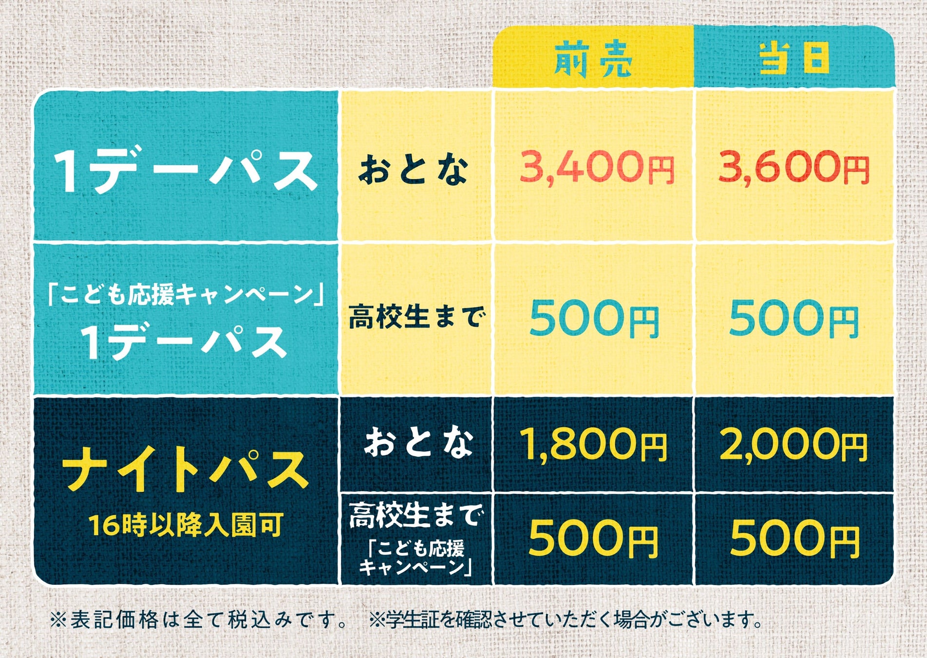 ・ナイトパス:16:00~閉園1時間前まで