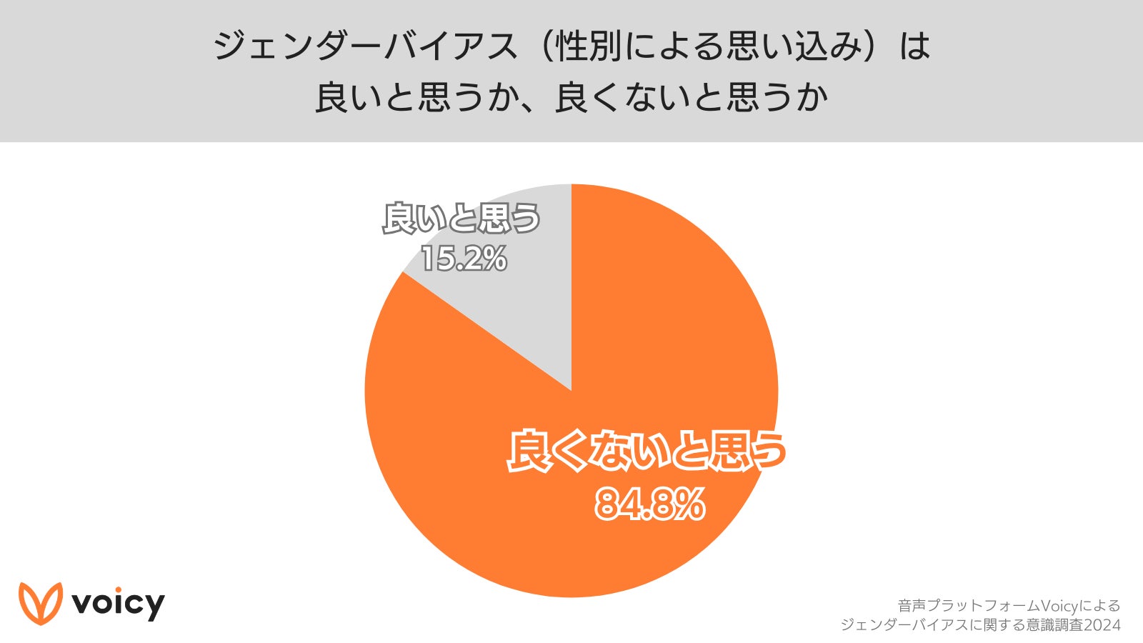 Voicyは、Voicyのユーザー2,175名を対象に、ジェンダーバイアス(性別による思い込み)に関する意識調査を実施しました。今回の調査で、「ジェンダーバイアス(性別による思い込み)は良いと思うか、良くないと思うか」という質問に対し、「良くないと思う」と84.8%の人が回答。また、「ジェンダーバイアス(性別による思い込み)を持たないように気をつけているかどうか」という質問に対し、「気をつけている」と83.9%の人が回答しました。