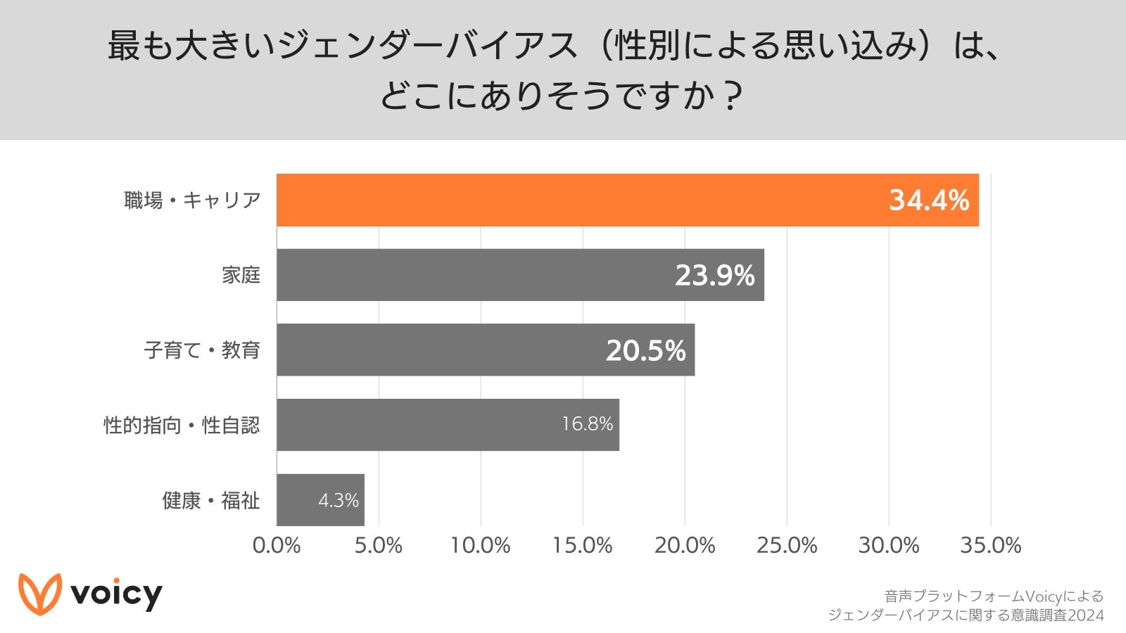 さらに、「あると思う」と回答した人に向けた、「最も大きいジェンダーバイアス(性別による思い込み)は、どこにありそうですか?」との質問に対しては、「職場・キャリア」が34.4%と最も多く、次いで「家庭」が23.9%、「子育て・教育」が20.5%の順に多い結果となりました。※