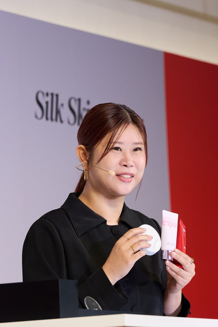 当日は、ゲストとしてメイクアップアーティストのGeorgeさんにもご登壇いただき、シルクスキンレイヤークッションについて、Georgeさんならではの使い方・おすすめポイントなどをご紹介。普段からエスポアの商品を愛用いただいているGeorgeさんからも、今回の新作クッションファンデに関して、「素肌感のある軽いシルクのような仕上がりに大満足しています!」とご好評いただきました。