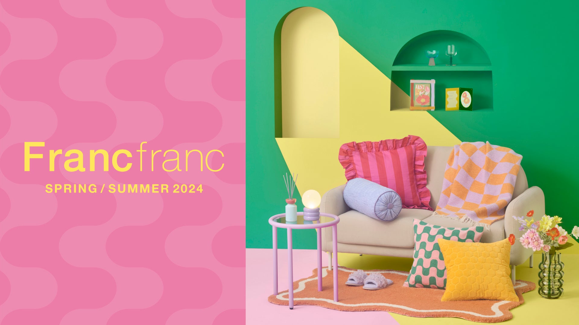 2024年Spring&Summer Collectionのテーマは『EASY POP!(イージー ポップ)』。再び動き出した日常をカラフルに彩るため、陽気な色使いや乗りの良いリズムで、躍動的なエネルギーから着想を得た元気いっぱいの美的感覚を自由にミックスした、ポジティブなパワーが漲るコレクションです。ライフスタイル空間を軽やかにポップに演出するアイテムをラインアップしました。喜びや陽気さを演出する柄やカラー、遊び心ある素材と洗練されたデザイン、フォルムに変化を加えたインテリアオブジェ、繊細なラインやウェーブを用いたグラフィカルなアイテムで心弾む楽しいSpring&Summerの季節を演出します。これから始まる新しい季節を軽やかに自由に楽しむライフスタイルをFrancfrancらしい世界観で提案します。