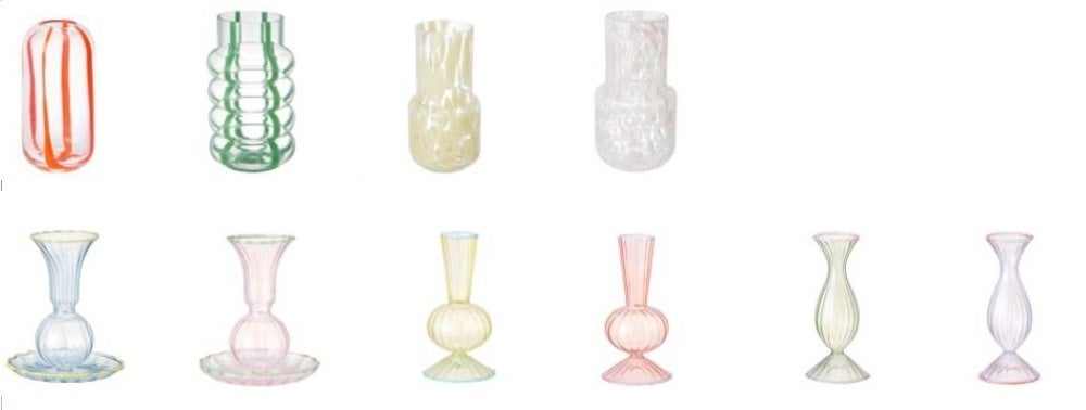繊細なハンドメイドのミニガラスベースです。縁のカラーリングがそれぞれ異なり、カラフルなガラスの色とお花の組み合わせをお楽しみいただけます。お花を1~2輪ほど短めに飾って並べるのに向いており、切り花を最後まで楽しむこともできます。
