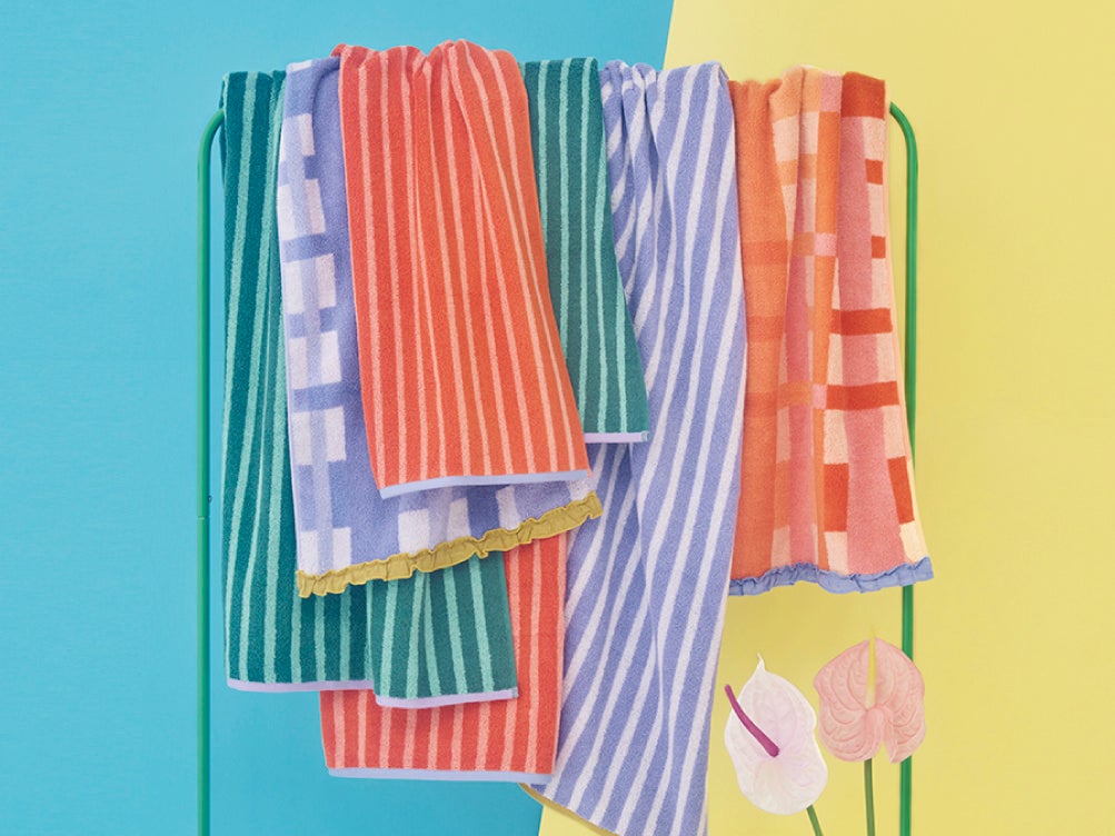 明るいカラーでポップなデザインのタオルシリーズです。しっかりとした目詰めでお洗濯しやすいので日常使いしやすく、フックに掛けることができるネームタグが付いています。トレンド感あるカラーとデザインで、バスタイムの気分を上げてくれます。色違いで組み合わせて、春のギフトにもおすすめです。