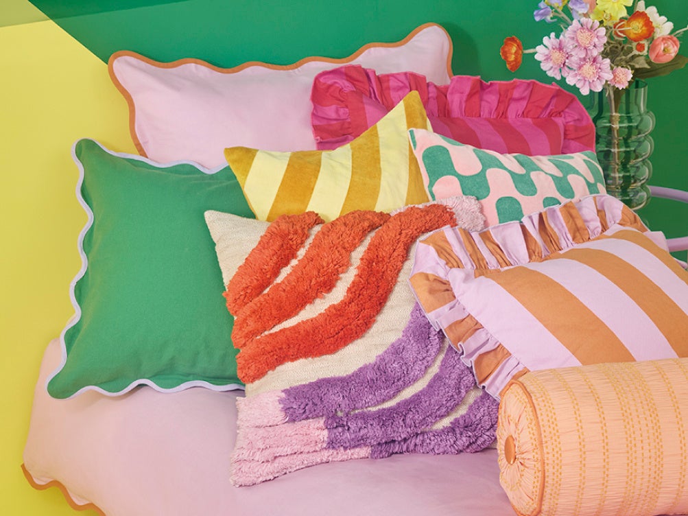 シェニール糸のステッチが特徴的なボルスタークッションです。ポップなカラーリングと春夏らしい生地感でお部屋を明るく彩ります。シンプルな形状なのでベッドでもソファでも使いやすくリラックスタイムに最適です。