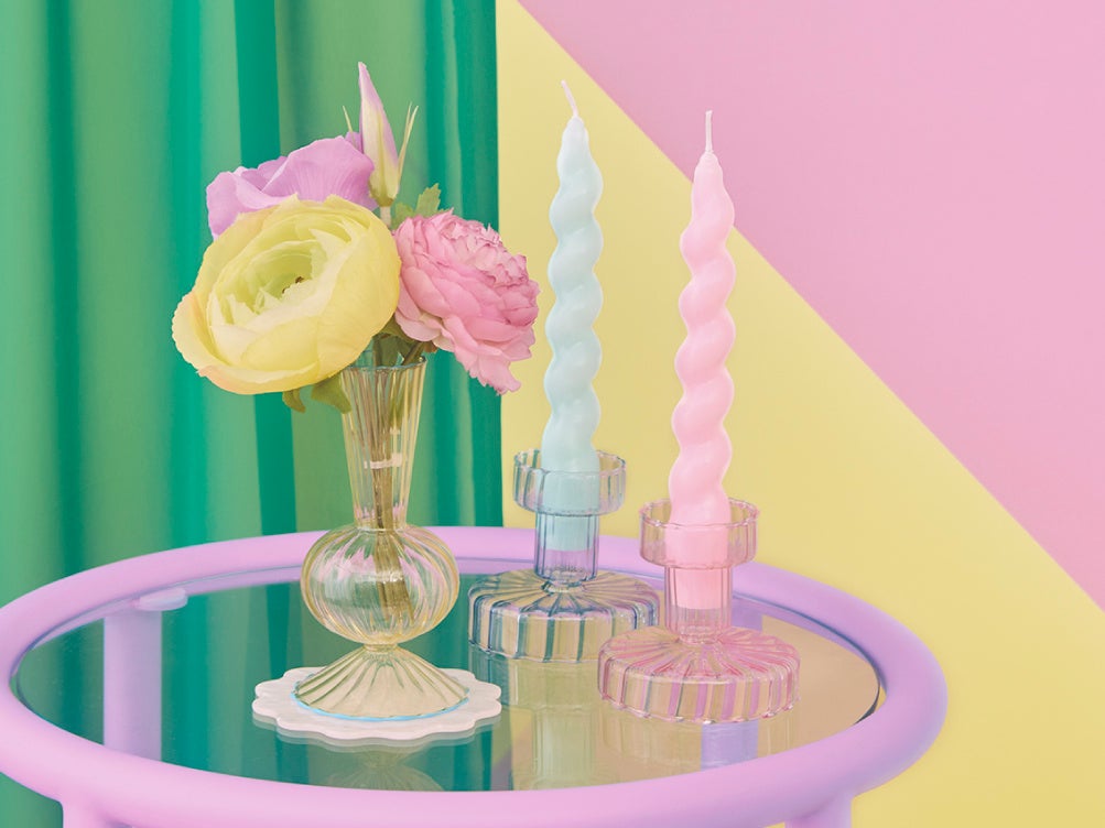 パステルカラーのキャンドルと繊細なハンドメイドのガラスキャンドルスタンドのセットです。ドレッサーやサイドテーブルなどのお気に入りスペースに飾るだけでトレンド感ある空間が演出できます。