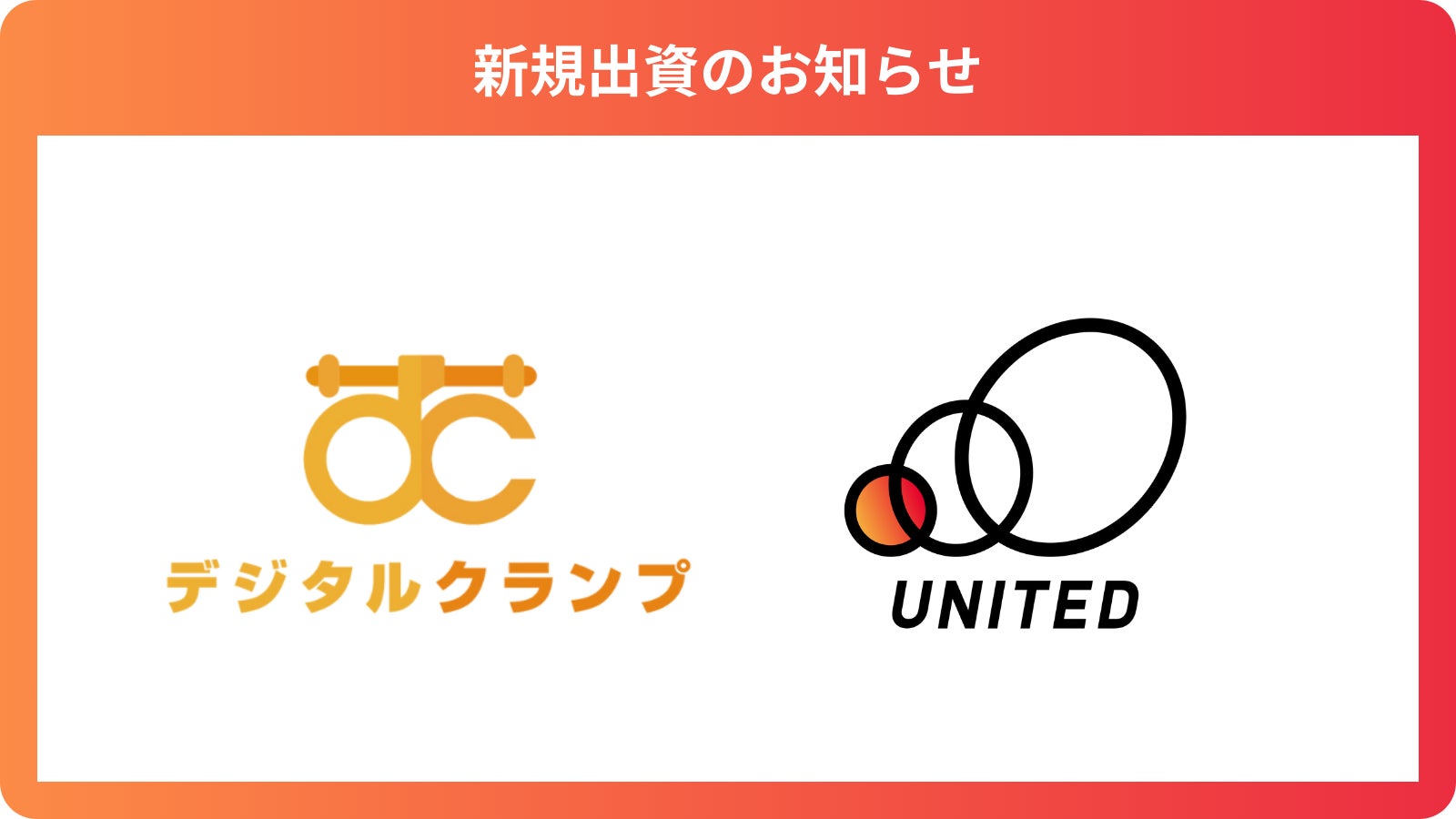ユナイテッド株式会社(本社:東京都渋谷区、代表取締役社長 兼 執行役員:早川 与規、証券コード:2497、以下「ユナイテッド」)は、株式会社デジタルクランプ(本社:東京都豊島区、代表取締役:高橋 知大、以下「デジタルクランプ」)へ出資いたしました。