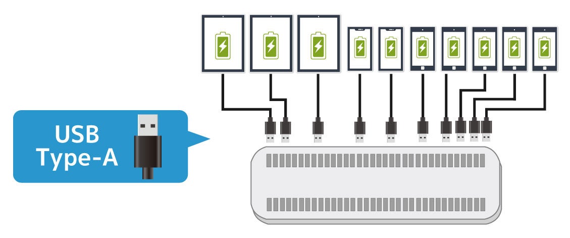本製品は、スマホやタブレット、モバイルバッテリーなど、USB充電に対応したデバイスを最大10台まで充電できるUSB充電器です。USB Type-Aを10ポート搭載しており、合計最大出力96Wに対応しています。