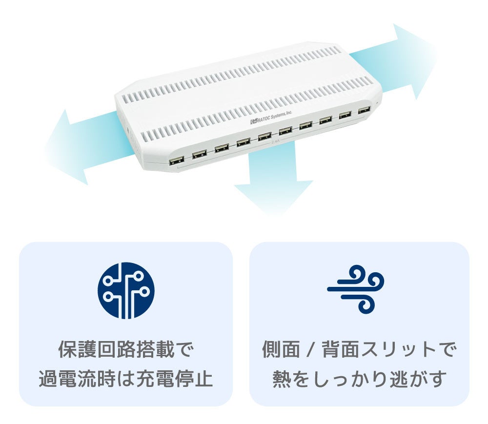 本製品は接続機器や充電状況に応じて、最適な電流を出力。効率的かつ安全な充電をおこないます。