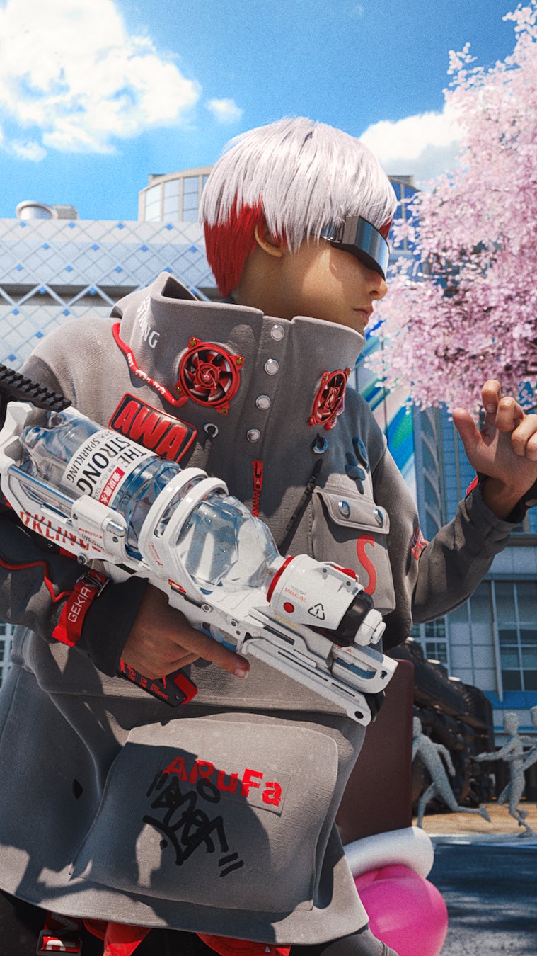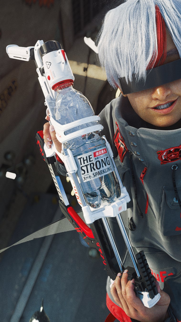 ARuFa氏が「強渋谷」で装着するアイテムデザインは「ザ・ストロング」をベースにしたカラーリングや形状を意識している。激泡シューターは、その泡を口にした者の心をリフレッシュする機能を持ち、激泡スケートは、強炭酸の圧力を動力としてスピードを最大化する機能を搭載している。