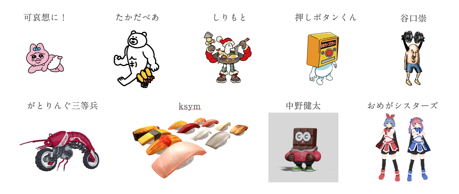 コラボクリエイター:可哀想に! / たかだべあ / しりもと / 押しボタンくん / 谷口崇 / がとりんぐ三等兵 / ksym / 中野健太 / おめがシスターズ(順不同)