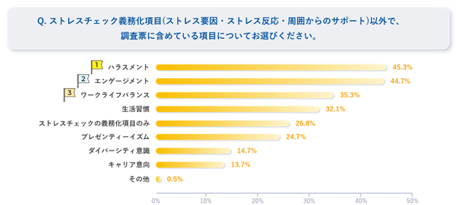 「ハラスメント」や「エンゲージメント」などストレスチェック義務化項目以外の調査も同時に行われているケースも増えていることから、今後は調査項目の在り方に加え、複合的な調査における結果の読み解き方についてもより一層のニーズが高まるものと考えています。