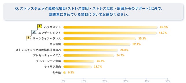 ストレスチェックに含めている項目として、「ハラスメント」や「エンゲージメント」がともに4割を超える。義務化となっているストレスチェックに絡めて他の調査も実施していることがうかがえる。