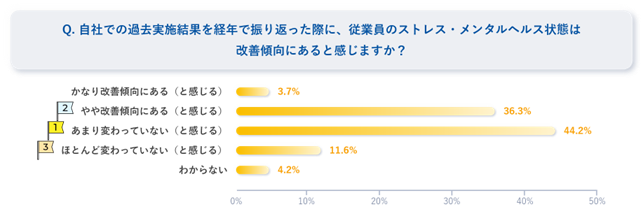 自社のストレス・メンタルヘルスの状態における経年変化について、4割は「改善している」と回答した一方、約4.5割が「変わらない」と回答している。