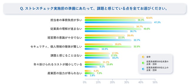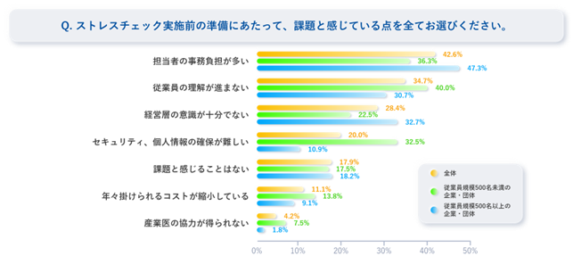 ストレスチェック実施「前」の課題について「担当者の事務負担が多い」が最も多く挙げられる。次いで「従業員の理解が進まない」と続く。同項目において500名未満の企業・団体では500名以上と比較し、約10ポイント高い。