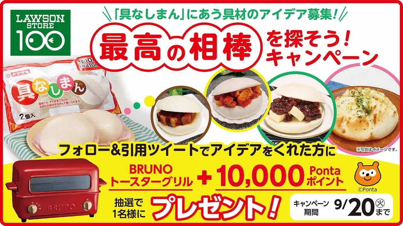 リニューアル発売を記念して、ローソンストア100の公式Twitter上で、「具なしまん」と相性が最高な具材のアイデアを募集する「具なしまんの最高の相棒を探そう!」キャンペーンを開催します。具なしまんに実際に挟んでみたら美味しかった具材のほか、「きっと合うのではないか?」というアイデアも併せて募集します。ご応募いただいた方の中から抽選で1名様に、BRUNOトースターグリルと、10,000Pontaポイントをプレゼントします。