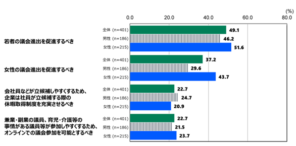 若者の議会進出を促進するべき 49.1% 女性の議会進出を促進するべき 37.2%