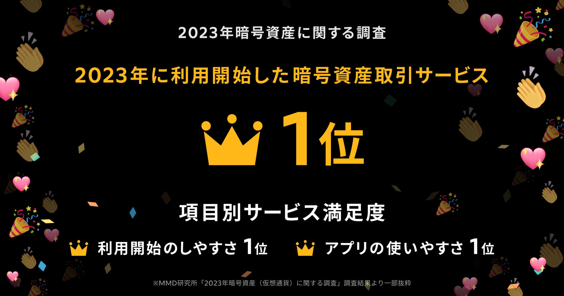 メルコインは、これまでビットコイン取引を行ったことがない方でも、かんたん・安心にご利用でき、ビットコインを身近に感じていただくことを目指して、ビットコイン取引サービスを開始しました。2023年3月にサービス提供開始してから約7か月で100万人を突破し、2023年末には、MMDLabo株式会社が運営するMMD研究所(https://mmdlabo.jp/)が発表した「2023年暗号資産(仮想通貨)に関する調査」において、「2023年に利用開始された暗号資産取引サービス」の項目で1位に、項目別のサービス満足度において「利用開始のしやすさ」「アプリの使いやすさ」についても、それぞれ1位となりました(※2)。