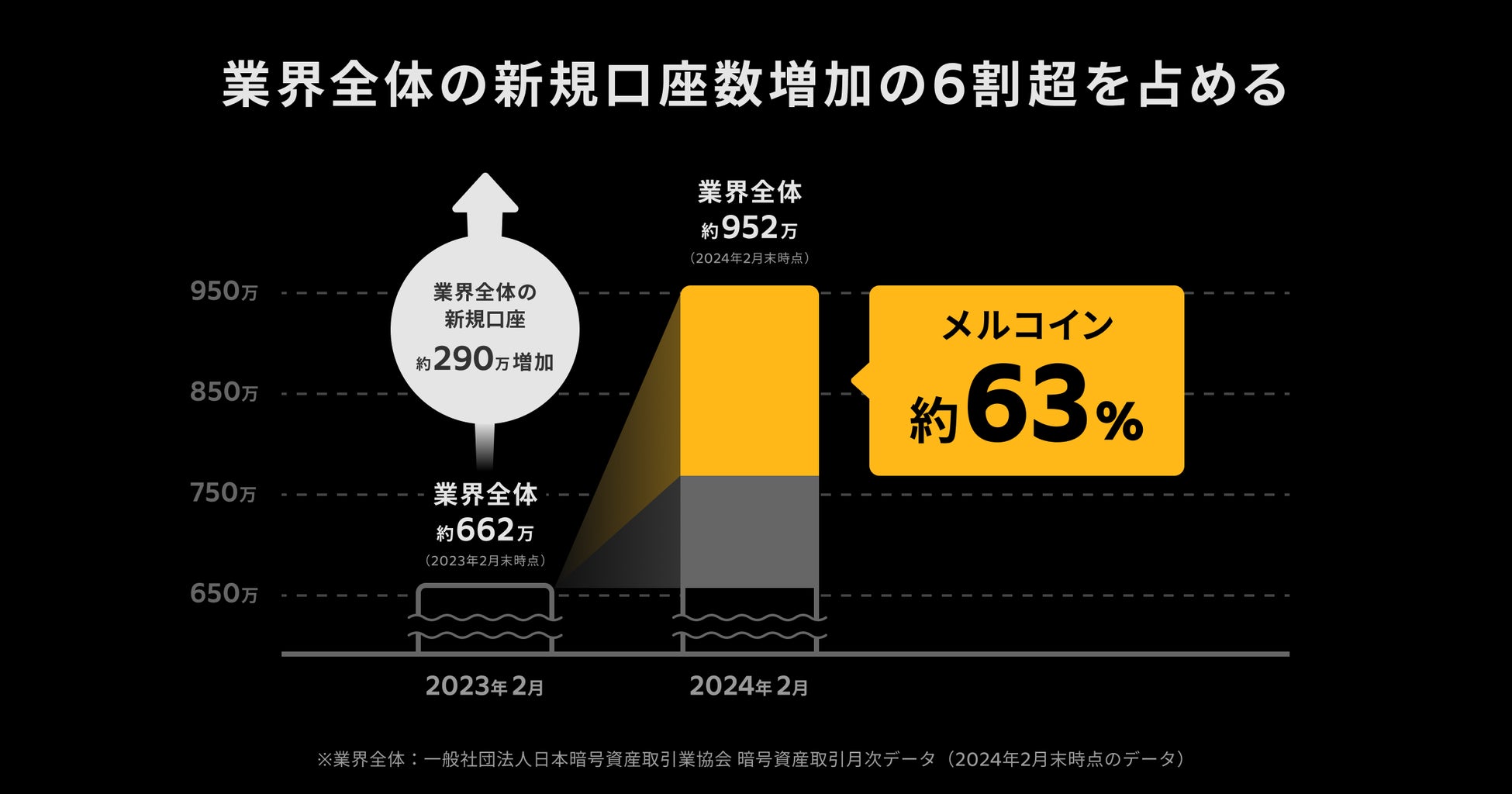 2024年2月末の時点で、日本国内の暗号資産取引口座数は約952万に上っており(※3)、2023年2月末~2024年2月末までの1年間では業界全体で取引口座数が290万件増加しています。「メルカリ」のビットコイン取引サービスは、同期間の業界全体の取引口座増加数の内63%の割合を占める勢いで利用者を拡大してきました。