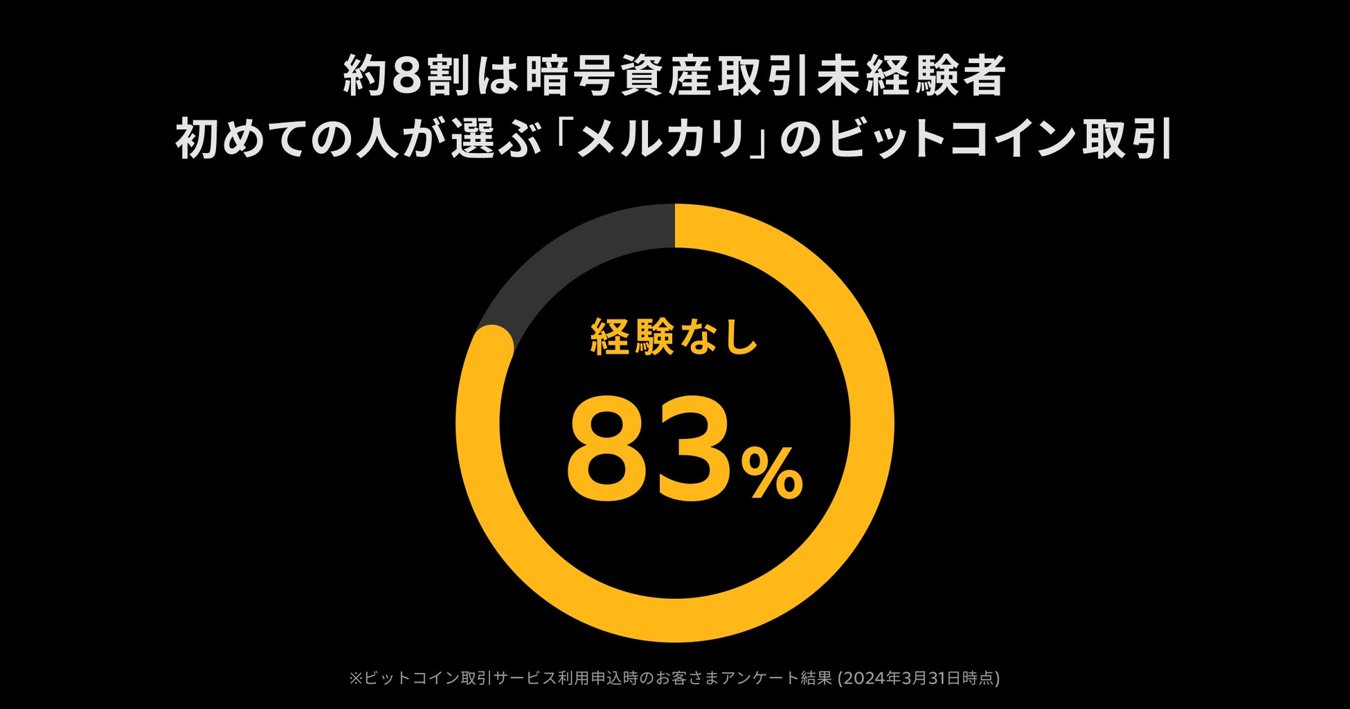実際にご利用いただいてるお客さまの83%は、暗号資産取引歴「なし」と回答されており、多くの方がメルカリアプリで初めての暗号資産取引を体験いただいています。