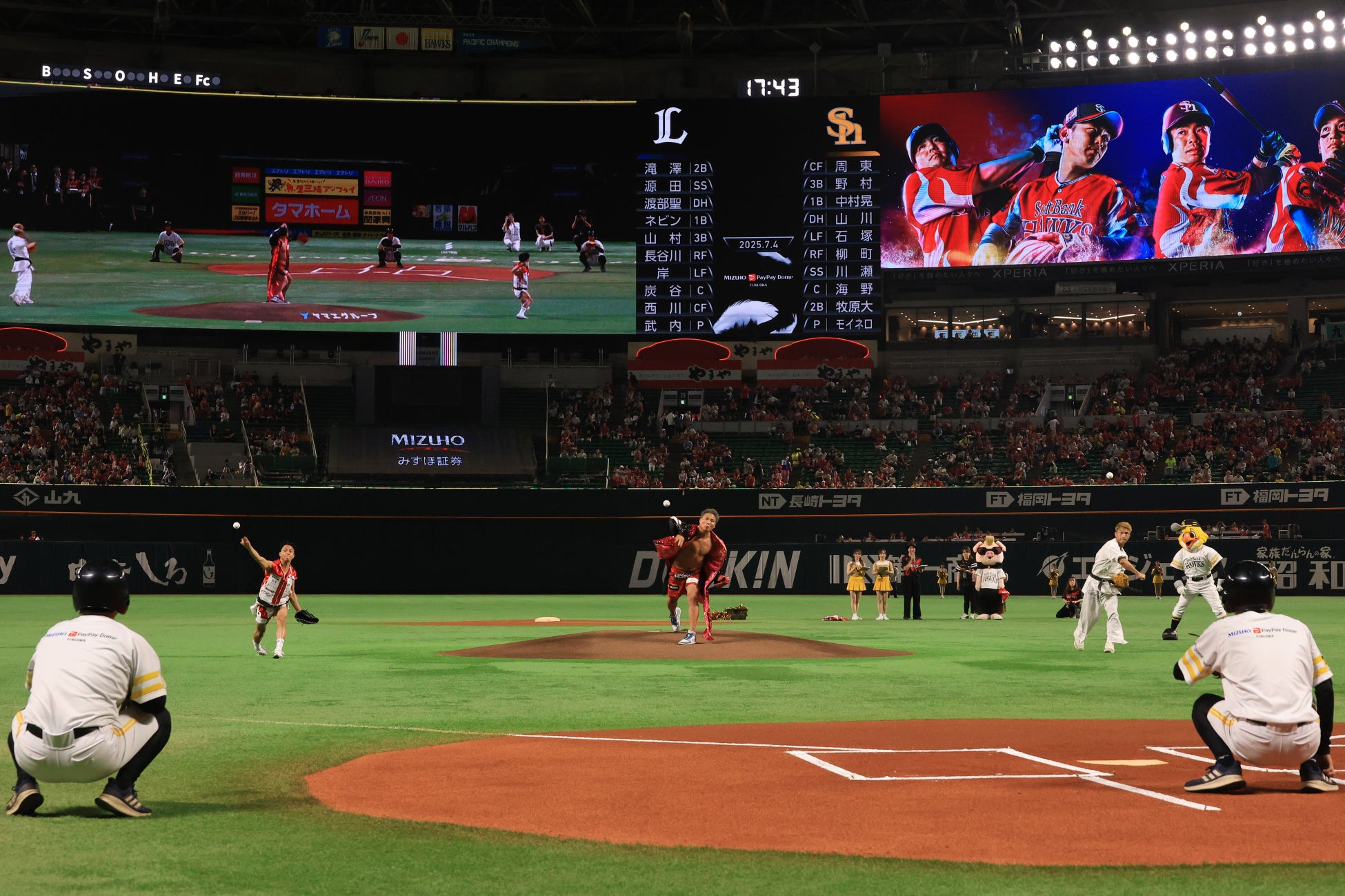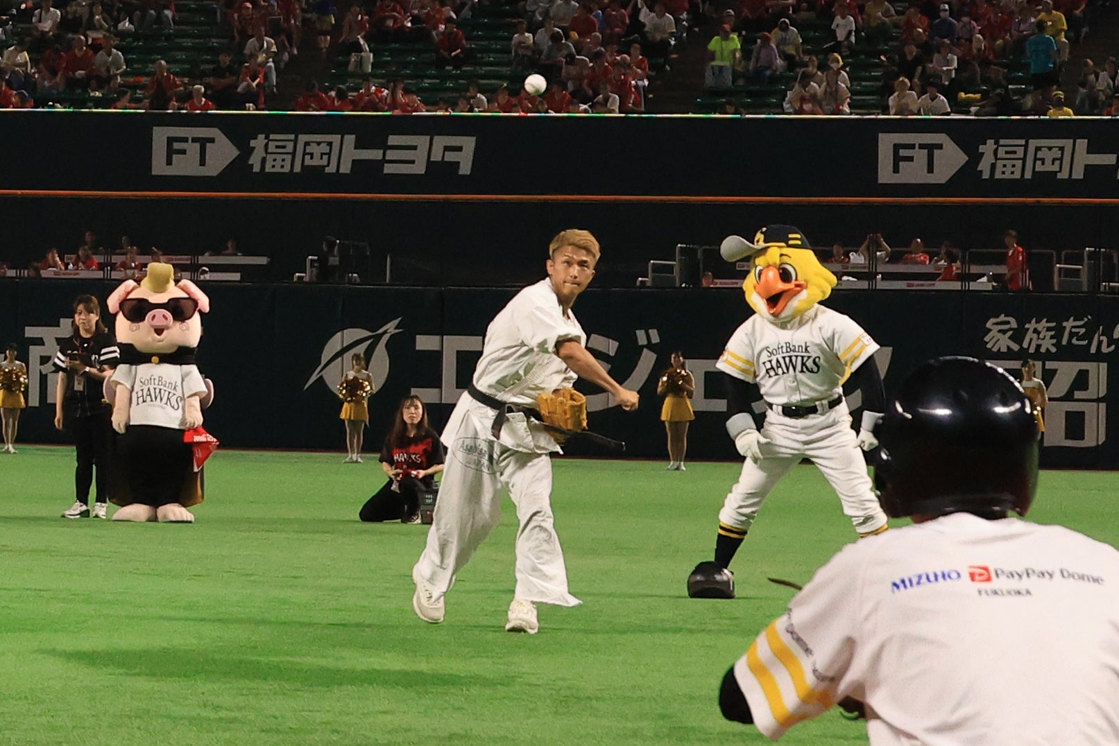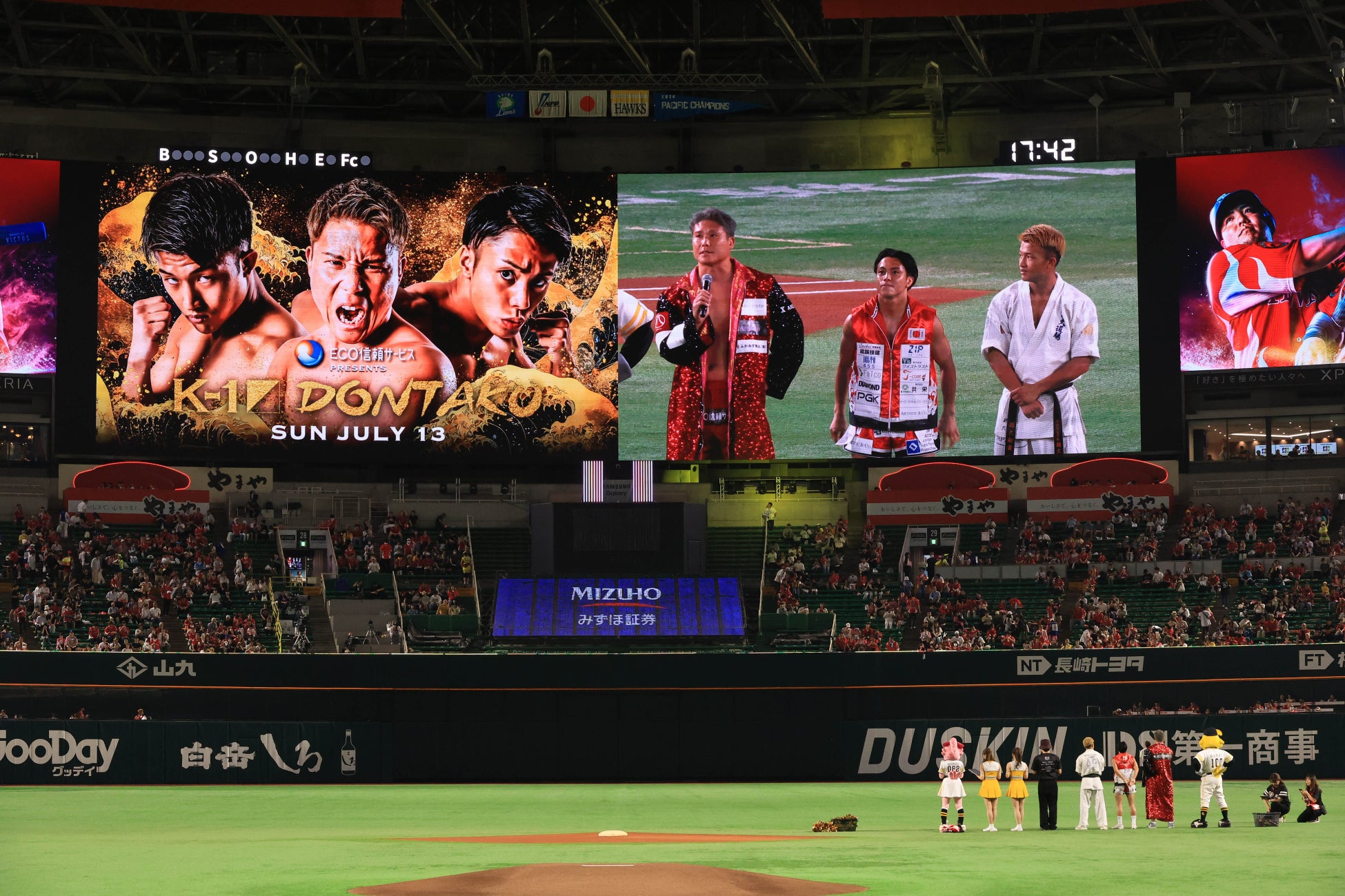 7月4日(金)にみずほPayPayドームで行われた「福岡ソフトバンクホークスvs.埼玉西武ライオンズ」において、K-Jee、朝久裕貴、石井一成が「K-1 DONTAKU」PRタイムとしてマイクパフォーマンス&3選手並んでのセレモニアルピッチに登場した。