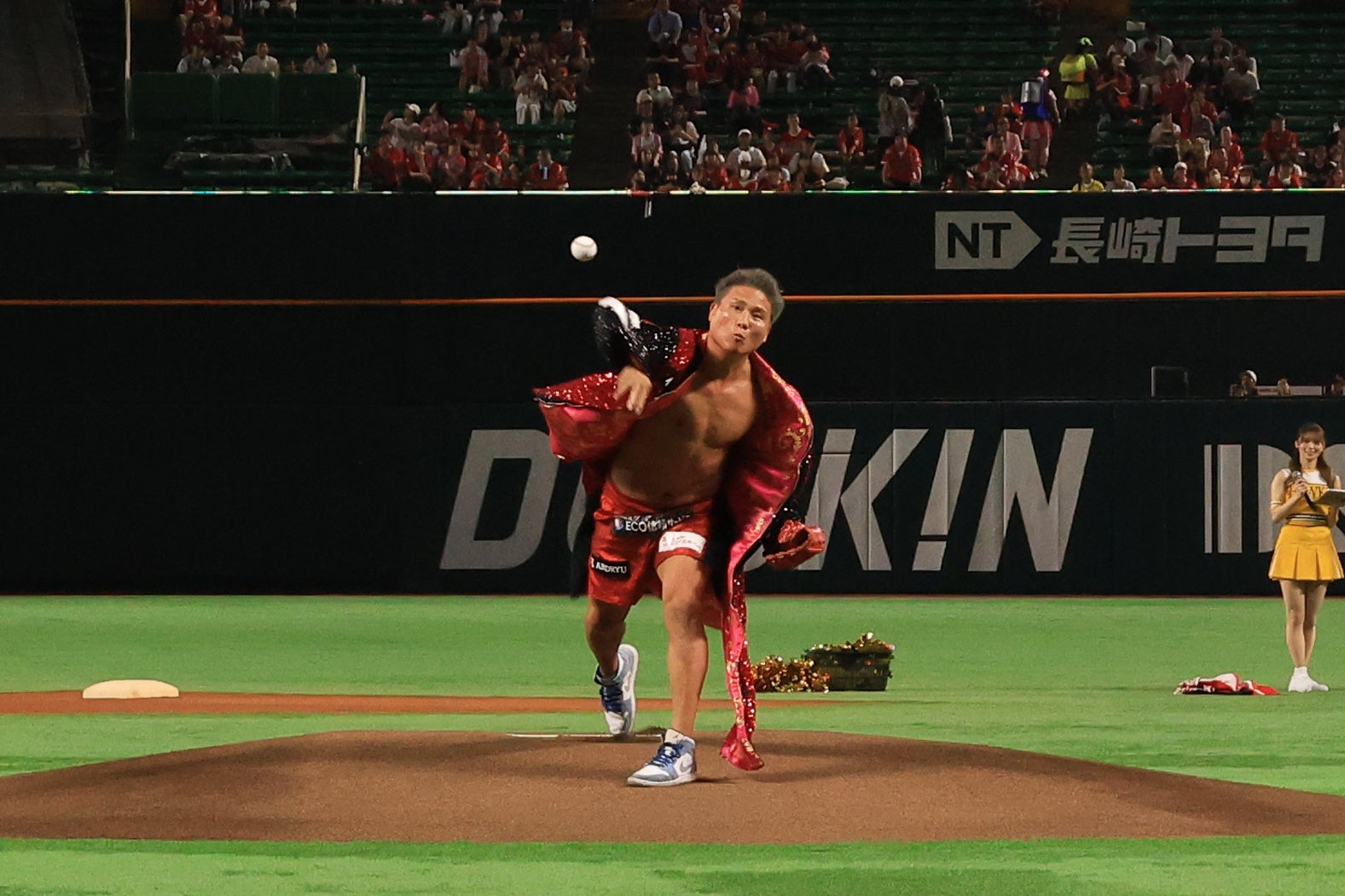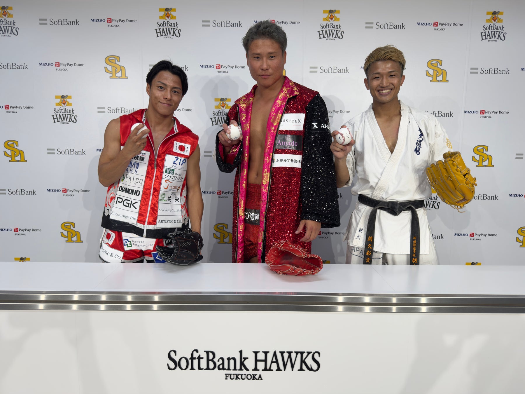 K-1選手・K-Jee、朝久裕貴、石井一成が「福岡ソフトバンクホークス」セレモニアルピッチに登場!7.13「K-1 DONTAKU」福岡大会PRに向け豪快なピッチングで会場沸く