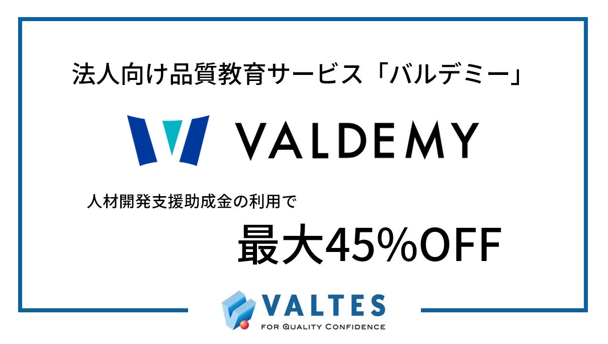 ソフトウェアのテスト・品質向上トータルサポート企業のバルテス・ホールディングス株式会社(本社:大阪市西区、東京都千代田区、代表取締役会長 兼 社長:田中 真史)は、ソフトウェア学習プラットフォーム「バルデミー」を利用した研修について、厚生労働省が実施する人材開発支援助成金の「人材育成支援コース」の対象となった場合、受講料のうち最大45%が助成金として支給されることについてご案内します。