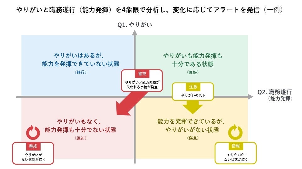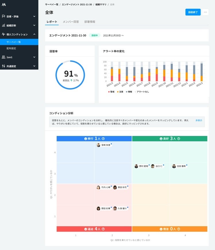 「個人コンディションサーベイ」機能は、企業が従業員に対して「やりがい」「能力発揮」に関する内容を毎月1~2回のペースで聞くことができます。サーベイ結果は、従業員・組織単位で「良好」「倦怠」「移行」「逼迫」などの4象限の図で表示されるため、データを分析する専任担当がいなくても従業員のコンディションを一目で理解できます。