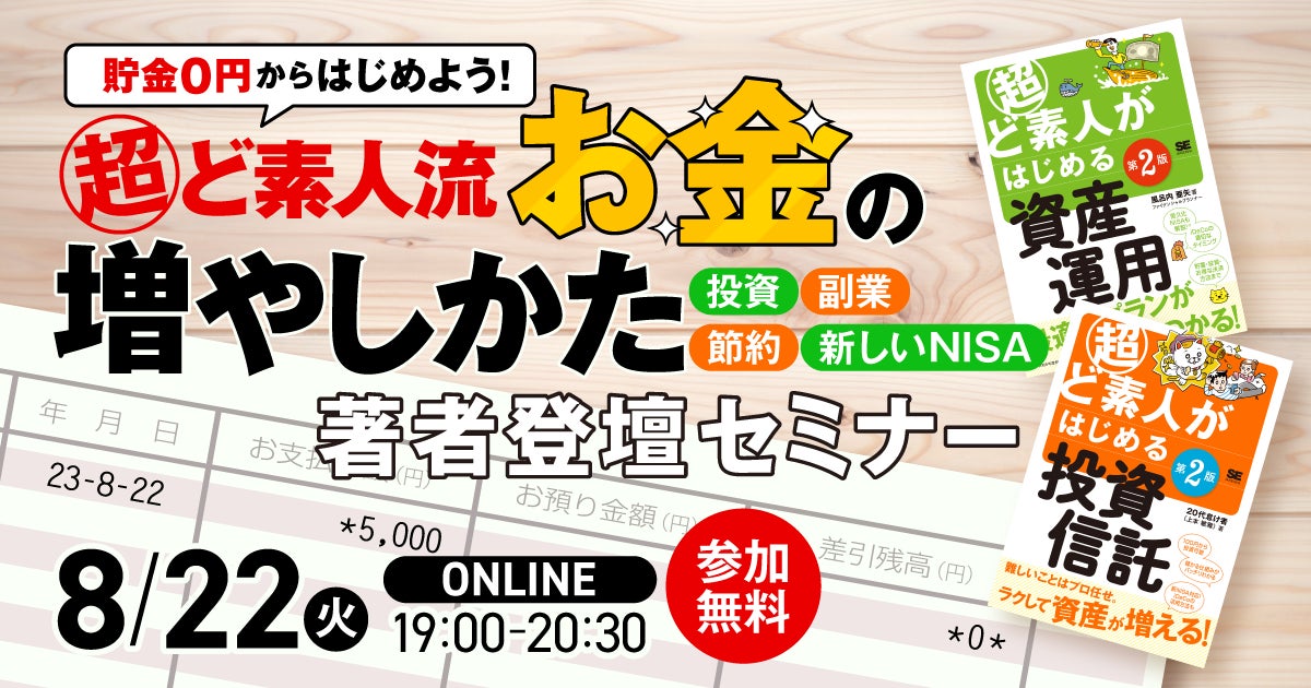株式会社翔泳社(本社:東京都新宿区舟町5、社長:佐々木幹夫)は、書籍「超ど素人シリーズ」の著者2名によるオンラインセミナー「貯金0円からはじめよう! 超ど素人流 お金の増やしかた」を2023年8月22日(火)に開催します。参加費は無料です(事前登録制)。