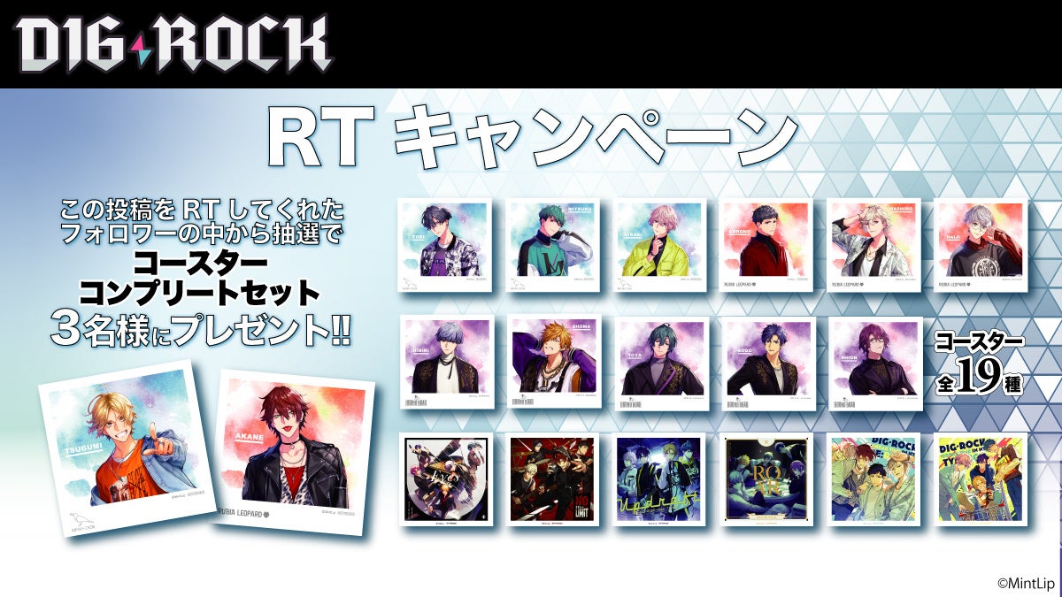 DIG-ROCKキャンペーンの開催を記念してTwitterにてフォロー&リツイートキャンペーンを開催いたします。GiGO のお店/セガのお店 公式アカウント(https://twitter.com/GENDA_GiGO)をフォローの上で、該当のツイートをリツイートされたお客さまの中から抽選で3名様に「ノベルティコースターコンプリートセット」を進呈いたします。