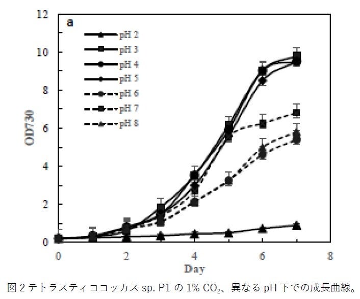 取得した株は、pH3から5の酸性条件で最もよく育ち、高い増殖速度(μ=1.47 d-1)と、最終到達光学密度※6(OD730の値が9.25)を示しました(図2)。テトラスティココッカスがトリアシルグリセロール※7などの形態で含有する脂肪酸の総量はpH5で最も多く、次いでpH3、pH7でそれぞれ102.88 μg/mg, 75.8 μg/mg, 67.77 μg/mgとなりました。