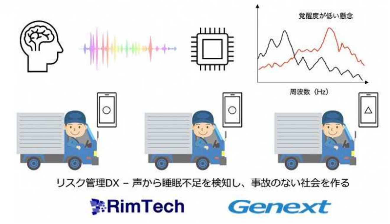 概要:リスク計測テクノロジーズが有するリスク計測技術を活用し、ジェネクストが提供する車両運行管理アプリ「AI-Contact」に、発話音声から睡眠不足を検知するエンジンを開発・追加し、睡眠不足による運転リスクの可視化する実証を行う。これにより、睡眠不足を起因とする道路交通法違反及び交通事故の削減を目指す。
