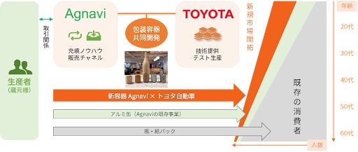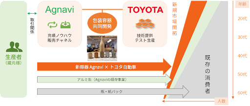概要:Agnaviが有する全国の酒蔵とのネットワークや容器への日本酒充填ノウハウと、トヨタ自動車が有する自動車で培ったモノづくり技術を連携させ、日本酒における新規容器を開発し、販売する実証を行う。これにより、消費量が落ち込む日本酒業界における新規ニーズ獲得を目指す。
