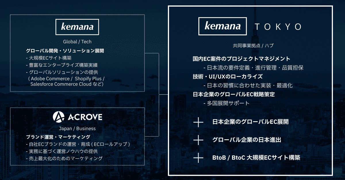 Kemanaは、Adobe Commerce (Magento) 、Commercetools、Salesforce、Shopify Plusの公式パートナーとして、H&M、スターバックス、キヤノン、ラコステ、サムソナイト、POLO、TUMI、リーボック、ソニー・エンターテインメント、KOSEをはじめとする世界的ブランドのEC構築を手掛けるデジタルコマースエージェンシーです。 このたび、Kemanaが有する世界標準の開発技術力と、ACROVEが有する国内EC市場における事業再生・販売支援ノウハウを相互補完することで、日本企業のEC海外進出における技術的課題を解消し、グローバル展開を加速させるべく、共同拠点「Kemana TOKYO」の開設に至りました。