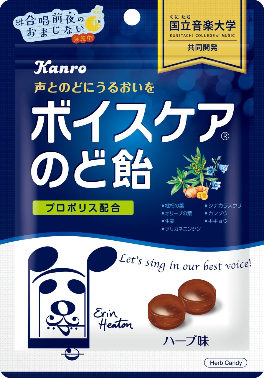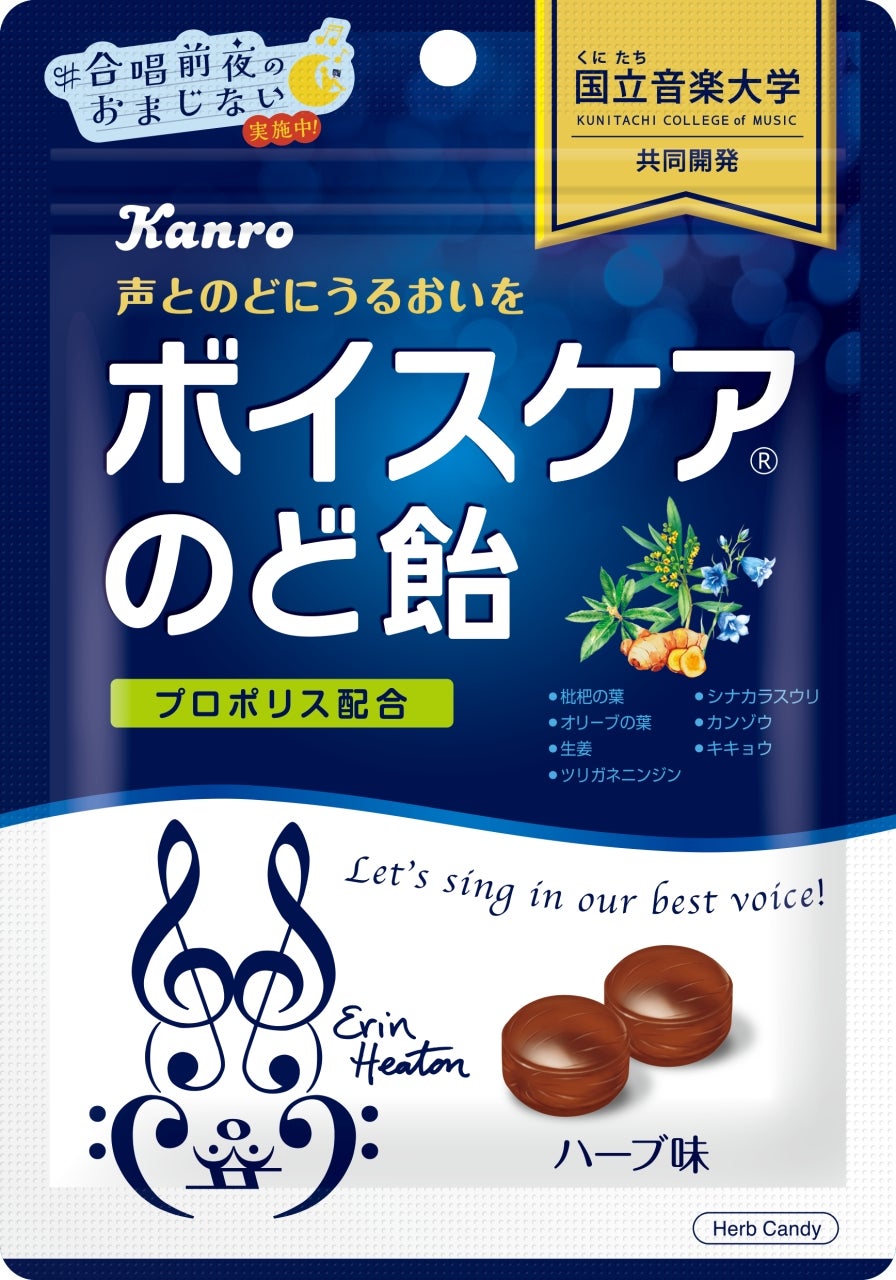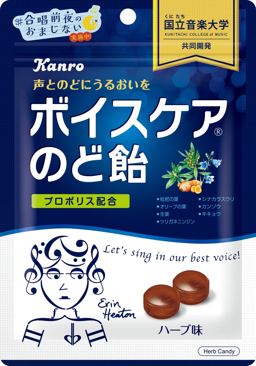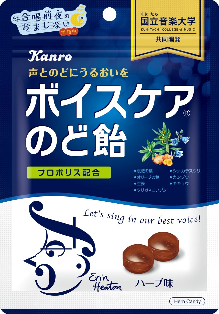 「ボイスケアのど飴」は、国立音楽大学声楽専修の教授監修のもと学生の声を聞きながら、試作を繰り返してつくった「声とのどを大切にする人」のためののど飴です。のどを大切にする人のための商品として原料にもこだわり、のどにやさしいハーブを使用しました。心地よい刺激に調整したプロポリスを配合することで、ほどよいメントール感のある味わいに仕上げました。