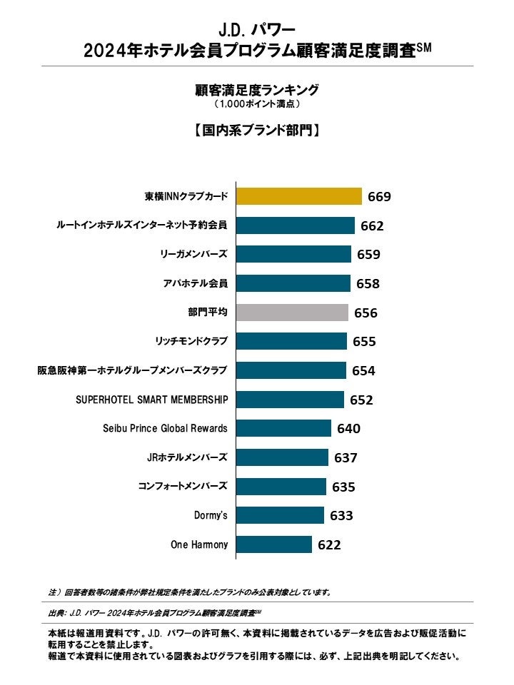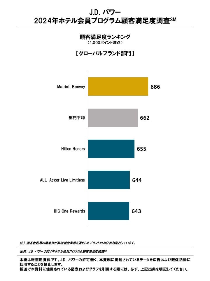 *³「J.D. パワー2024年ホテル宿泊客満足度調査」の対象ホテルグループ・チェーン(統一ブランド名で国内に1,500室以上展開しているブランド)が運営展開するホテル会員プログラム。複数ブランドが含まれるプログラムの場合、少なくとも1ブランド以上は国内で1,500室以上展開していることとする。