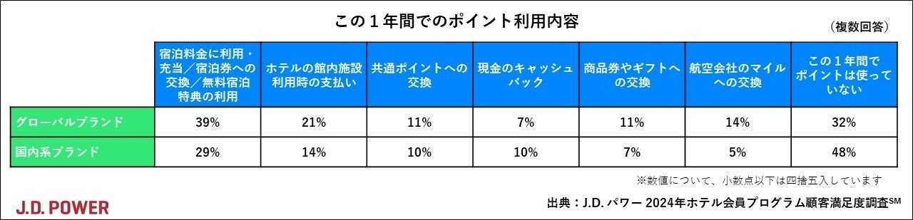 今回の調査対象の16プログラム中15プログラムがポイント制度を導入している。過去1年間でのポイントの利用内容を見ると、「宿泊料金に利用・充当/宿泊券への交換/無料宿泊特典の利用」がグローバルブランド(39%)、国内系ブランド(29%)共に最も多く挙がった。