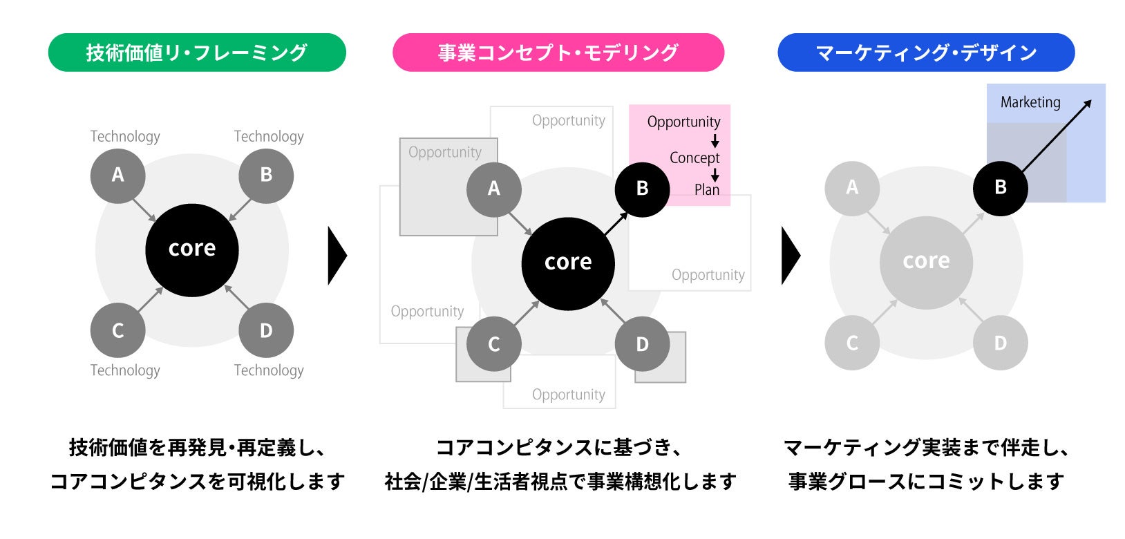 「R&D For Growth」は、企業のR&D部門、事業部門、経営部門と協業・連携しながら、企業が保有する独自の技術価値をコアコンピタンスとして再発見・再定義し、それをイノベーティブな事業構想へと昇華させていくプログラムです。また、事業化を見据えたマーケティングまで一気通貫で伴走・支援する実践的なアプローチにより、事業成長を多面的に支援します。