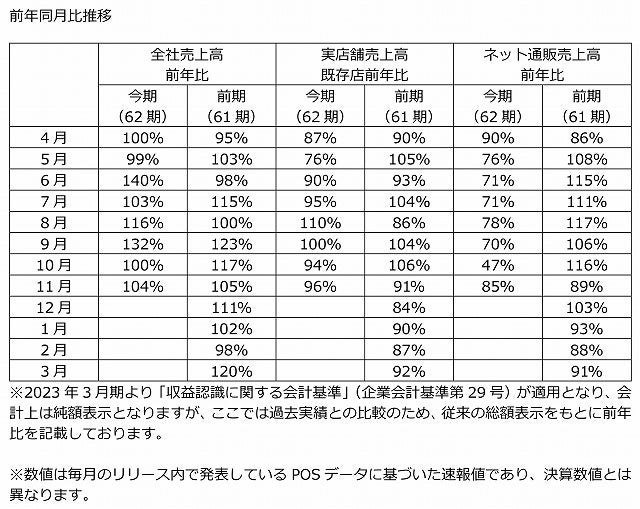 株式会社セキド(本社・東京都新宿区、社長・関戸正実、証券コード:9878)は、2023年11月度(10月21日~11月20日)の売上高が、全社の前年比104%、GINZALoveLove実店舗の既存店前年比96%、ネット通販の前年比85%となりました。なお、数値はPOSデータに基づいた速報値であり、決算数値とは異なります