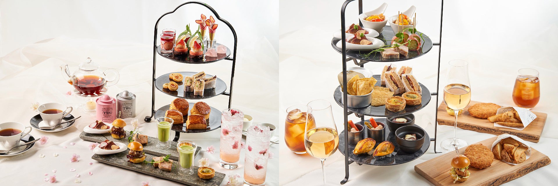ウェルカムドリンクには透き通った桜色がまるでドロップのような見た目から名付けたノンアルコールカクテル「さくらドロップ」を1人1杯ご用意。その他、お飲み物はシンガポール発世界屈指のラグジュアリーティーブランド「TWG Tea」から8種類の紅茶のほかコーヒー、カフェラテ、カプチーノ、エスプレッソ、アイスコーヒー、アイスティーをお好きなだけお召し上がりいただけます。