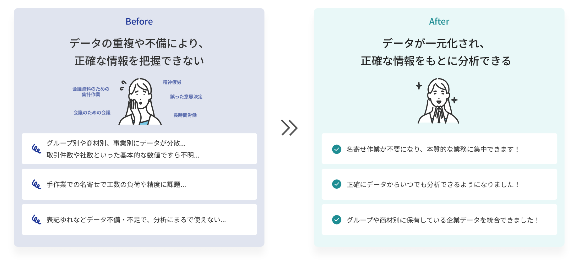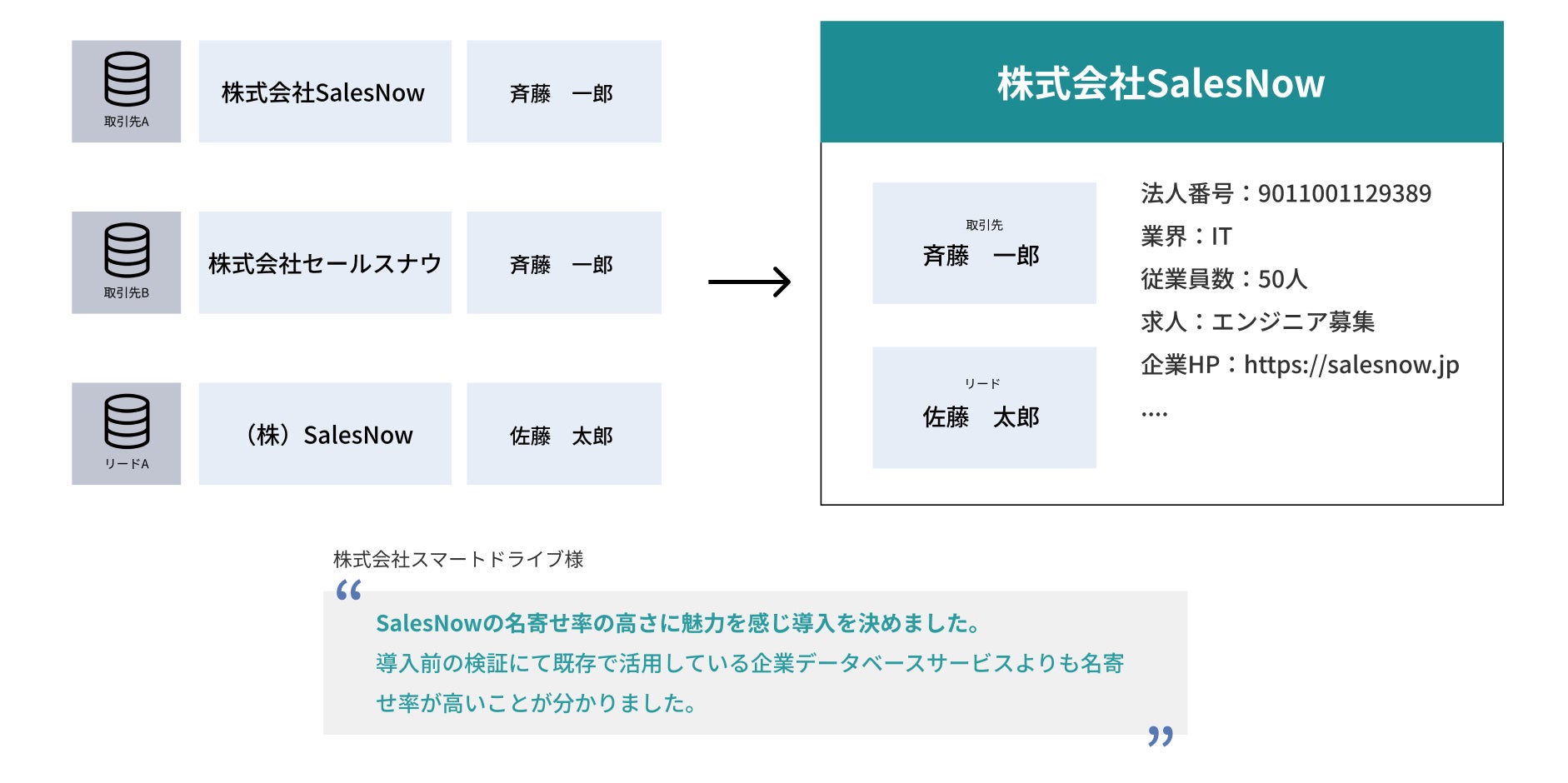 IT・モビリティ | 株式会社スマートドライブ | 85 | マーケティング・ビジネスオペレーション | Salesforce連携における高い名寄せ率と企業情報の自動付与が決め手。既存企業データとの名寄せ率が他サービスよりも高かった。 |