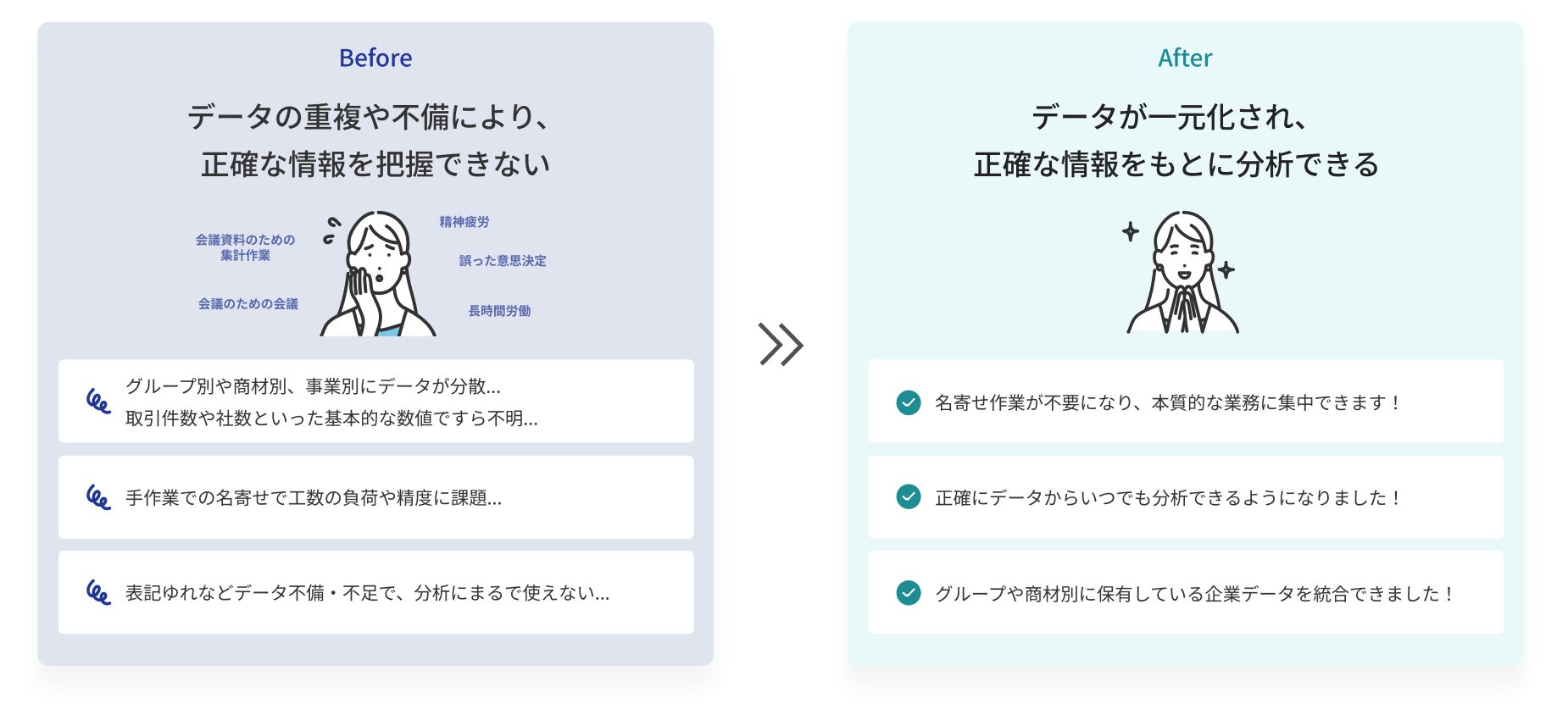 業界や従業員数など、分析に使える企業属性データを拡充します。データ活用のための基盤を整え、効率的なセールス・マーケティング活動を実現できます。名寄せ後に企業データを自動付与することで、データ分析基盤を整えます。