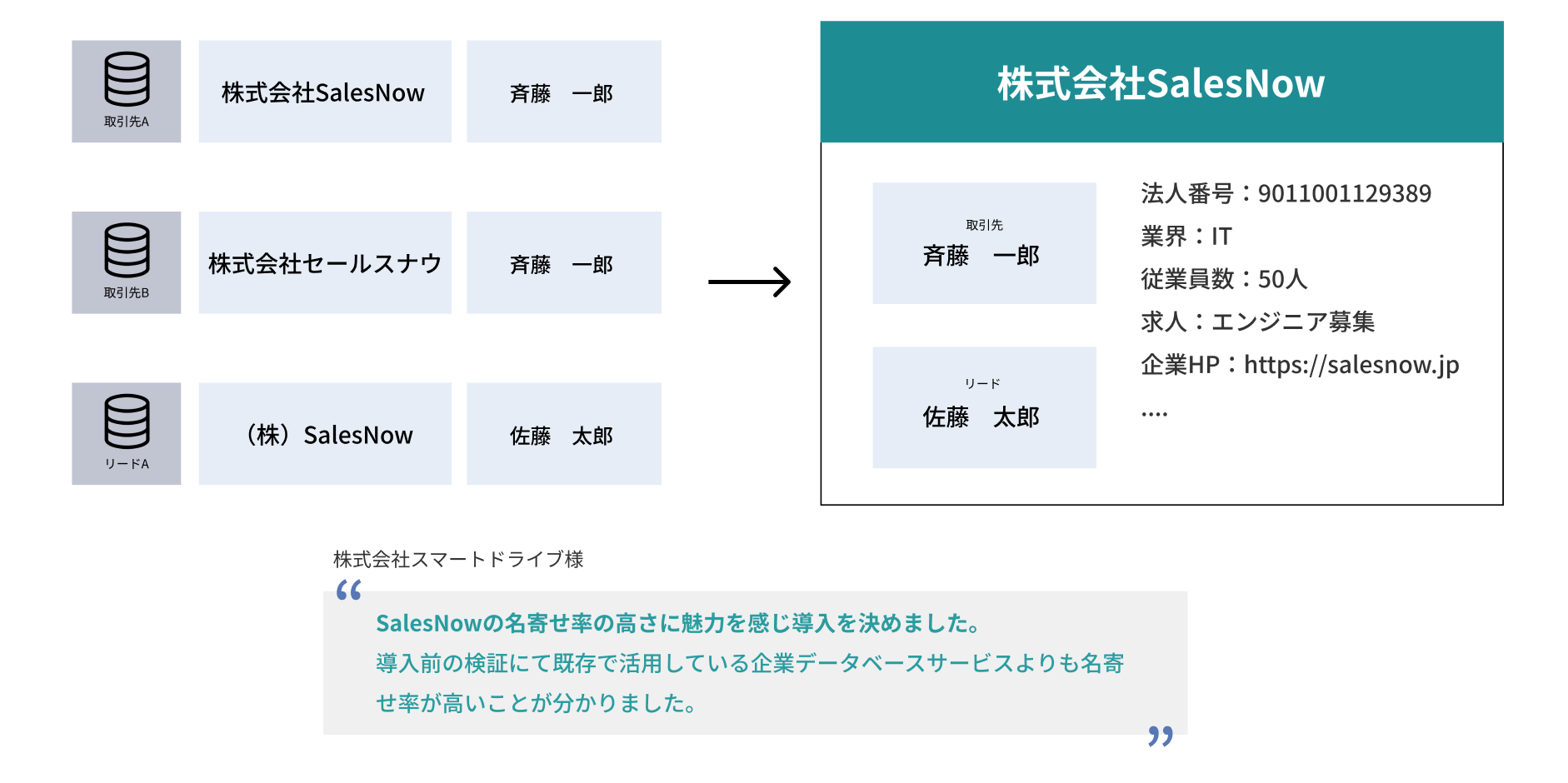 Salesforceのリード・取引先データを、たった2クリックでSalesNowの名寄せ機能に取り込みます。 高品質な企業データベースと、独自の名寄せテクノロジーで、スムーズな名寄せを実現。リードも取引先も散らばった情報を名寄せし一元化できます。540万社を完全網羅したデータベースで高い名寄せ率を実現します。