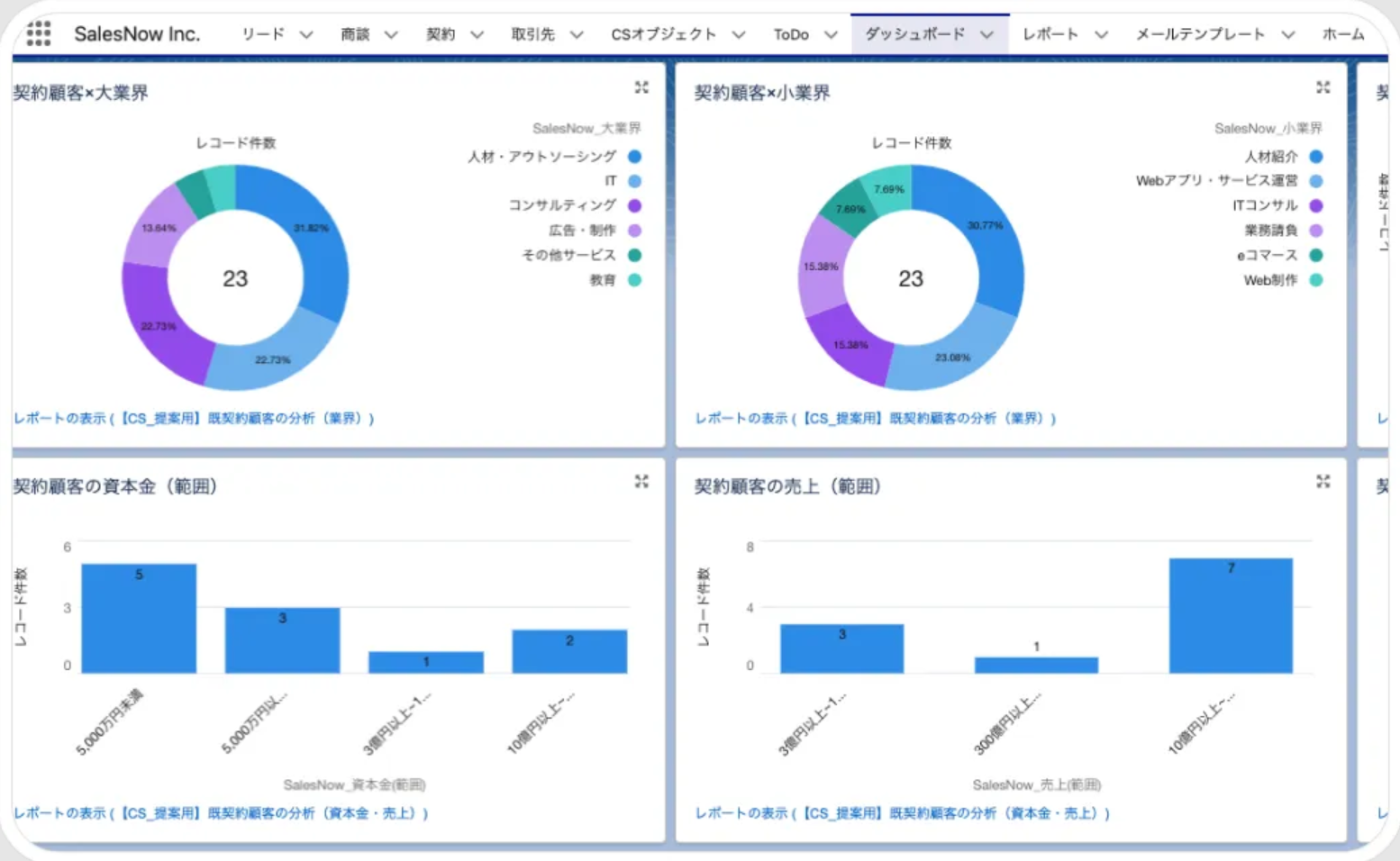 SalesNow豊富な企業データをもとに、リード・失注・受注企業の傾向から注力する業界や従業員規模・設立年月などを分析することができます。SalesNowと連携して付与した企業情報は、Salesforceの「レポート」や「ダッシュボード」の軸として幅広く利用できます。ターゲット別の施策状況をまとめた「ABMダッシュボード」を使えば、営業戦略の進捗状況が一目で俯瞰できます。