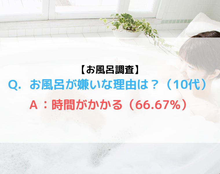 10代以下のお風呂嫌いの理由として圧倒的多数を占めたのが“時間がかかる”といったことでした。学校や部活動はもちろん、塾や習い事、友達との約束、大学生であればサークル活動など、10代若者には楽しいことが非常に沢山あります。また、体力のある若者はお風呂で疲労回復を・・・ということをそもそも考えないというのもあるのかもしれません。