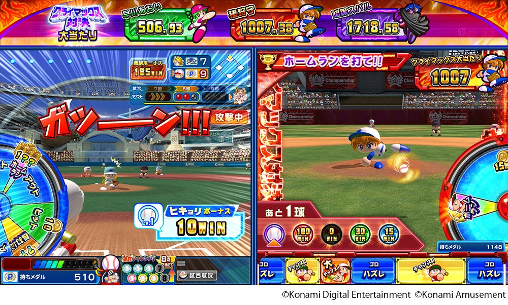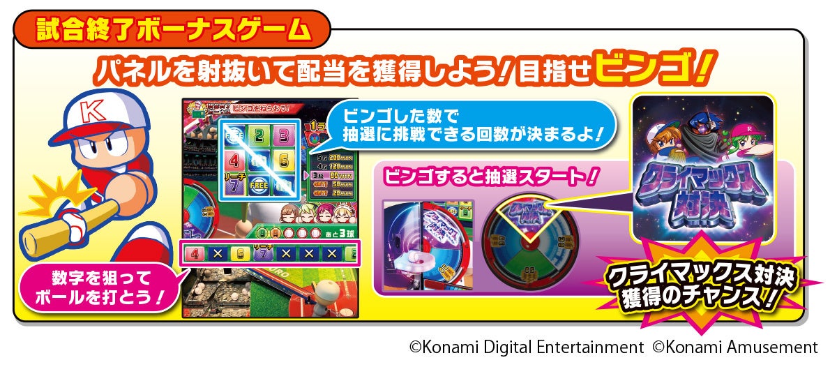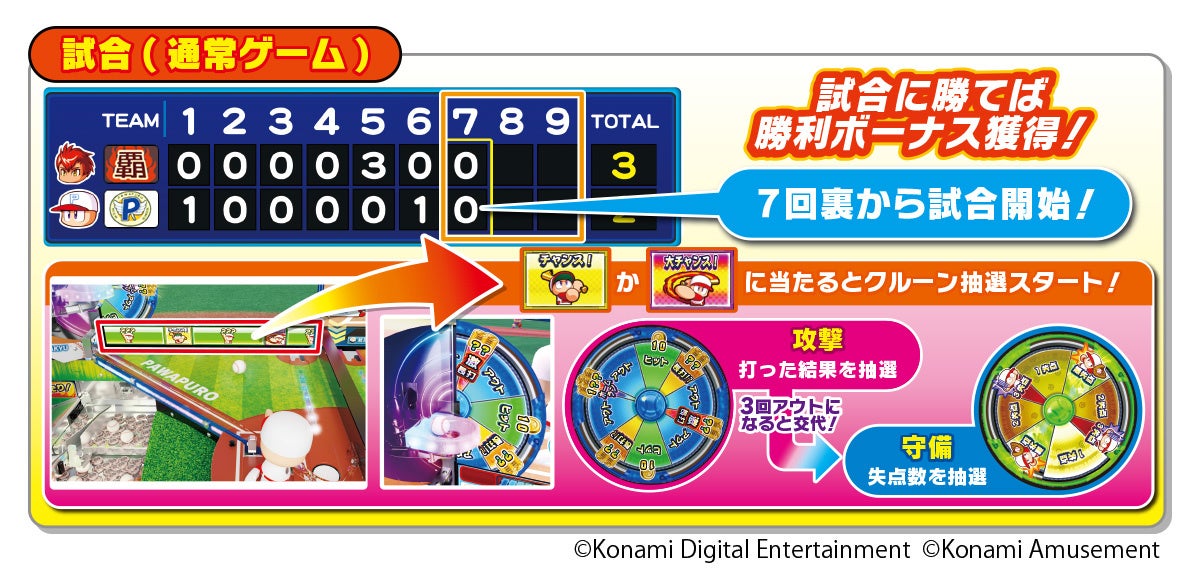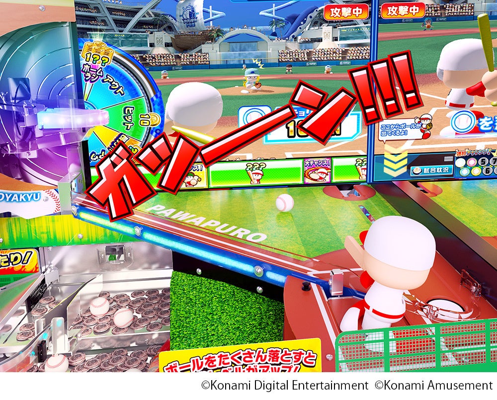 ピッチャーが投げたボールをタイミングよくバッティングする「パワプロ」ならではのプレーを、物理抽選「バッティング抽選」として実現し、プッシャーゲームでありながら野球の醍醐味であるボールを打つ気持ち良さを体験いただけます。