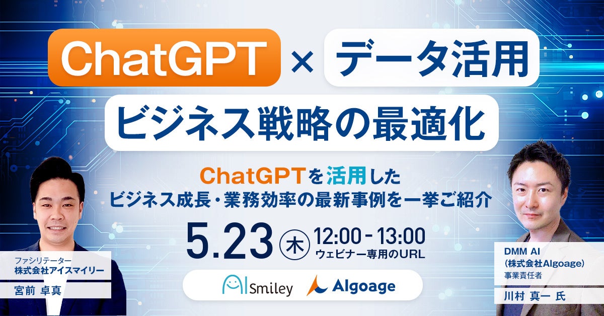 AIポータルメディアAIsmileyは、2024年5月23日(木)12時から特別企画としてChatGPT×データ活用をテーマにしたウェビナーを開催します。
