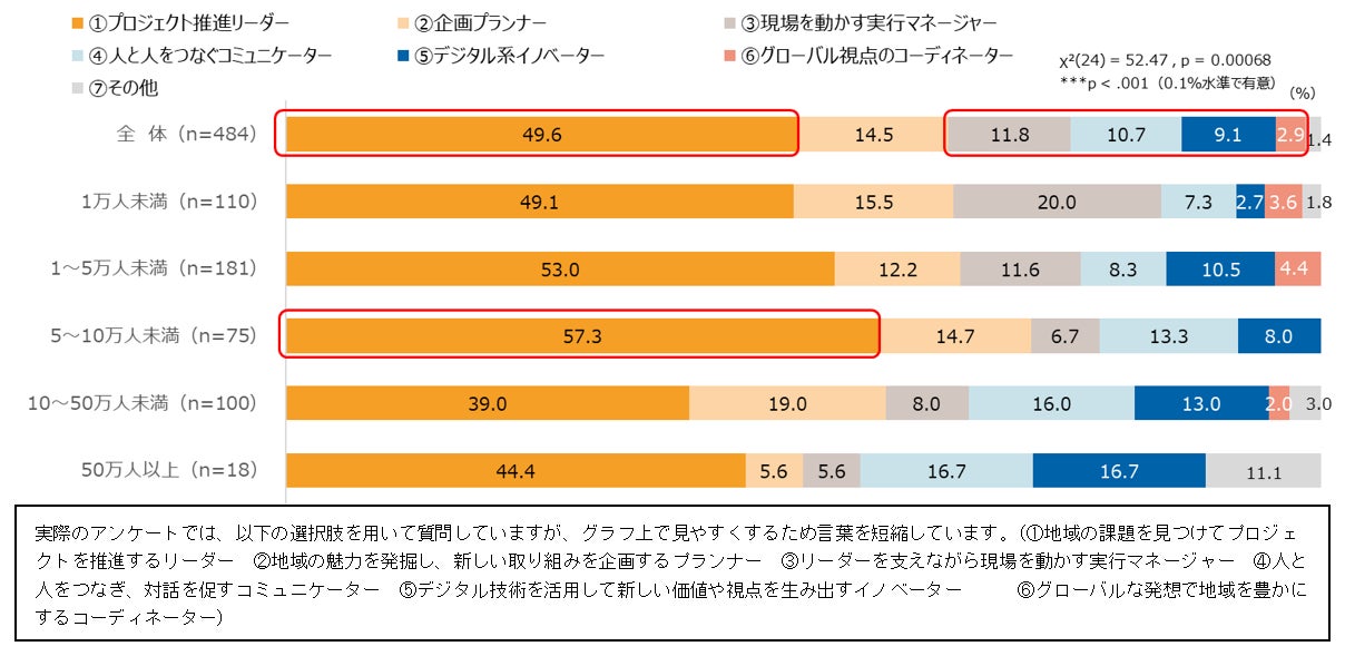 自治体職員として最も多く求められている人材像は、「プロジェクト推進リーダー(実際の選択肢文言は「地域の課題を見つけてプロジェクトを推進するリーダー(欄外参照 以下同)」)」であり、全体の49.6%という結果で、全国自治体の半分が現場直結のリーダーを求めているという回答でした。特に人口5~10万人未満の自治体では6割弱の57.3%に達しており、地域の実情に即した課題対応力が重視されている傾向が見て取れます。